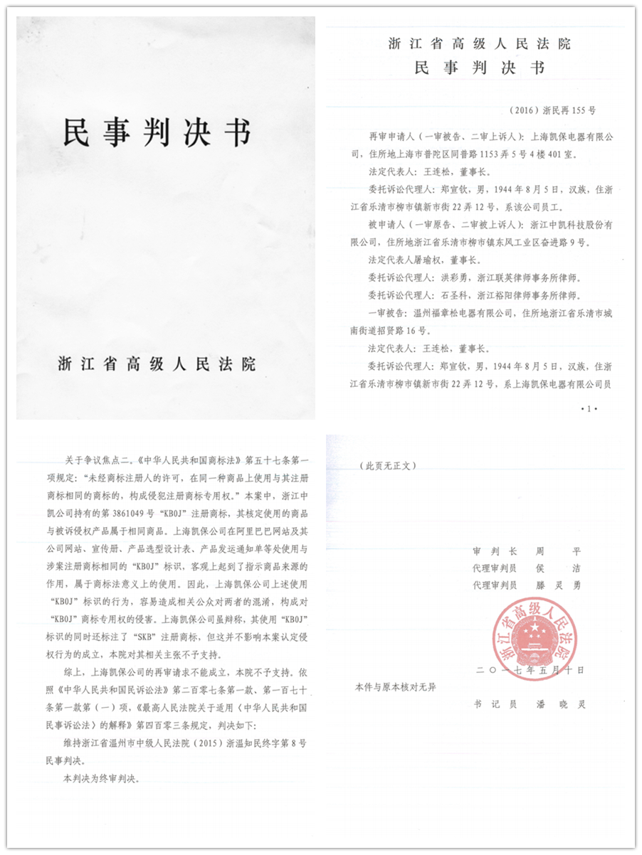 2017年5月10日,浙江省(shěng)高級人民法院作出終審(shěn)判決,草莓秋葵菠萝蜜黄瓜榴莲视频一場曆時三年的商標(biāo)維權案終於塵埃落定。本案(àn)得從2014年3月說(shuō)起(qǐ),因上海凱保長期蓄意侵害草莓秋葵菠萝蜜黄瓜榴莲视频商標權,在產品包裝盒、產(chǎn)品標(biāo)牌、企業官網、產品樣本、廣告等媒介平台上大量使用與草莓秋葵菠萝蜜黄瓜榴莲视频KB0、KB0J、KB0D等商標相似(sì)或近似字樣,並有意作一些誤導消費者的宣傳,被草莓秋葵菠萝蜜黄瓜榴莲视频訴至法院。樂清市法院受理此案後,通過大量的調(diào)查了解,以大量的事實證據為依據,認(rèn)定上海凱保侵權事實成立,判(pàn)令上海凱保停止侵權,賠償損失。上海凱保(bǎo)不服,上訴到溫州市中院,溫州市中院(yuàn)通過對案(àn)件的審查,最終在充分的事實和證據基礎上作出了(le)維持一審判決的二審判決。上(shàng)海凱保為達到其不可告人的目的,使(shǐ)出一套“纏”和“拖”的絕(jué)技,對二審法院的判決仍然(rán)表示不服,向浙江省高院提出再審申請。省高院受理案件後,開(kāi)庭再審該案,在大(dà)量的事實和證據麵(miàn)前,最終作出(chū)了維持溫州市中院二審判決的終審判決。這(zhè)一判決(jué),標誌著一些別(bié)有用(yòng)心,惡意侵害或蓄(xù)意侵占(zhàn)草莓秋葵菠萝蜜黄瓜榴莲视频商標(biāo)權的不(bú)法行為的破滅。